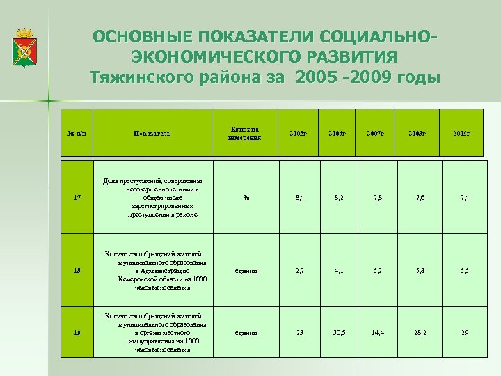 ОСНОВНЫЕ ПОКАЗАТЕЛИ СОЦИАЛЬНОЭКОНОМИЧЕСКОГО РАЗВИТИЯ Тяжинского района за 2005 -2009 годы № п/п Показатель Единица измерения 2005 г 17 Доля преступлений, совершенная несовершеннолетними в общем числе зарегистрированных преступлений в районе % 18 Количество обращений жителей муниципального образования в Администрацию Кемеровской области на 1000 человек населения 19 Количество обращений жителей муниципального образования в органы местного самоуправления на 1000 человек населения 2006 г 2007 г 2008 г 2009 г 8, 4 8, 2 7, 8 7, 6 7, 4 единиц 2, 7 4, 1 5, 2 5, 8 5, 5 единиц 23 30, 6 14, 4 28, 2 29