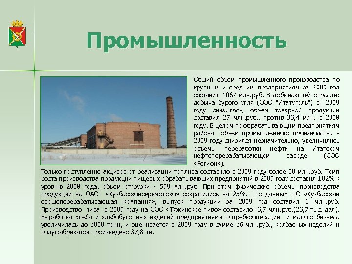 Промышленность Общий объем промышленного производства по крупным и средним предприятиям за 2009 год составил 1067 млн. руб. В добывающей отрасли: добыча бурого угля (ООО "Итатуголь") в 2009 году снизилась, объем товарной продукции составил 27 млн. руб. , против 36, 4 млн. в 2008 году. В целом по обрабатывающим предприятиям района объем промышленного производства в 2009 году снизился незначительно, увеличились объемы переработки нефти на Итатском нефтеперерабатывающем заводе (ООО «Регион» ). Только поступление акцизов от реализации топлива составило в 2009 году более 50 млн. руб. Темп роста производства продукции пищевых обрабатывающих предприятий в 2009 году составил 102% к уровню 2008 года, объем отгрузки - 599 млн. руб. При этом физические объемы производства продукции на ОАО «Кузбассконсервмолоко» сократились на 25%. По данным ПО «Кузбасская овощеперерабатывающая компания» , выпуск продукции за 2009 год составил 6 млн. руб. Производство пива в 2009 году на ООО «Тяжинское пиво» составило 6, 7 млн. руб. (26, 7 тыс. дал). Выработка хлеба и хлебобулочных изделий предприятиями потребкооперации и малого бизнеса увеличилась до 3000 тонн, и оценивается в 2009 году в сумме 36 млн. руб. , колбасных изделий и полуфабрикатов произведено 37, 8 тн.