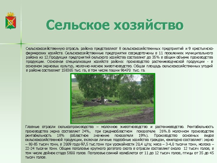 Сельское хозяйство Сельскохозяйственную отрасль района представляют 8 сельскохозяйственных предприятий и 9 крестьянскофермерских хозяйств. Сельскохозяйственные предприятия сосредоточены в 11 поселениях муниципального района из 12. Продукция предприятий сельского хозяйства составляет до 35% в общем объеме производства продукции. Основная специализация хозяйств района: производство растениеводческой продукции - в основном зерновых культур, молочно-мясное животноводство. Общая площадь сельскохозяйственных угодий в районе составляет 158365 тыс. га, в том числе пашни 96470 тыс. га. Главные отрасли сельхозпроизводства – молочное животноводство и растениеводство. Рентабельность производства зерна составляет 24%, при среднеобластном показателе 26%. В молочном производстве рентабельность 18% (областное значение показателя 19%). Производство основных видов сельскохозяйственной продукции, включая личные подсобные хозяйства граждан, ежегодно составляет: зерно – 80 -85 тысяч тонн, в 2009 году-97, 5 тыс. тонн при урожайности 20, 4 ц/га; мяса – 3 -4, 0 тысячи тонн, молока – 22 -24 тысячи тонн. Общее поголовье крупного рогатого скота в отрасли составляет около 12 тысяч голов, в том числе дойное стадо 5800 голов. Поголовье свиней колеблется от 11 до 12 тысяч голов, птицы от 35 до 45 тысяч голов.