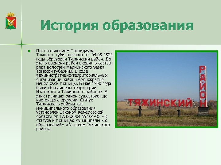 История образования n Постановлением Президиума Томского губисполкома от 04. 09. 1924 года образован Тяжинский район. До этого времени район входил в состав ряда волостей Мариинского уезда Томской губернии. В ходе административно-территориальных организаций район неоднократно менял свои границы. В мае 1960 года были объединены территории Итатского и Тяжинского районов. В этих границах район существует до настоящего времени. Статус Тяжинского района как муниципального образования установлен Законом Кемеровской области от 17. 12. 2004 № 104 -ОЗ «О статусе и границах муниципальных образований» и Уставом Тяжинского района.