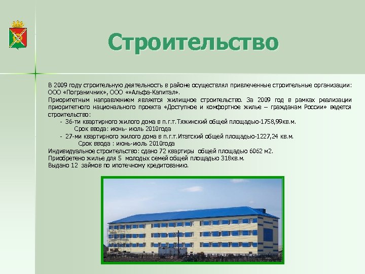 Строительство В 2009 году строительную деятельность в районе осуществлял привлеченные строительные организации: ООО «Пограничник» , ООО «» Альфа-Капитал» . Приоритетным направлением является жилищное строительство. За 2009 год в рамках реализации приоритетного национального проекта «Доступное и комфортное жилье – гражданам России» ведется строительство: - 36 -ти квартирного жилого дома в п. г. т. Тяжинский общей площадью-1758, 99 кв. м. Срок ввода: июнь- июль 2010 года - 27 -ми квартирного жилого дома в п. г. т. Итатский общей площадью-1227, 24 кв. м. Срок ввода : июнь-июль 2010 года Индивидуальное строительство: сдано 72 квартиры общей площадью 6062 м 2. Приобретено жилье для 5 молодых семей общей площадью 318 кв. м. Выдано 12 займов по ипотечному кредитованию.