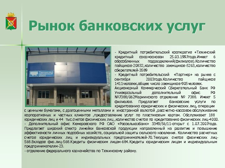 Рынок банковских услуг - Кредитный потребительский кооператив «Тяжинский кредитный союз» основан 25. 03. 1997 года. Имеет 6 обособленных подразделений(филиалов). Количество пайщиков-20832, количество заемщиков-5263, количество сберегателей-3589 - Кредитный потребительский «Партнер» на рынке с сентября 2003 года. Количество пайщиков 1411 человек, общее число заемщиков-905 человек. Акционерный Коммерческий Сберегательный Банк РФ Универсальный дополнительный офис РФ № 7388/062 Мариинского отделения № 7388. Имеет 5 филиалов. Предлагает банковские услуги по кредитованию юридических и физических лиц, операции с ценными бумагами, с драгоценными металлами и иностранной валютой , рассчетно-кассовое обслуживание корпоративных и частных клиентов , предоставление услуг по пластиковым картам. Обслуживает 188 юридических лиц и 44 тыс. счетов физических лиц , количество счетов по кредитованию физических лиц-4000. - Дополнительный офис Кемеровского РФ ОАО «Россельхозбанк» 3349/56/11 -открыт с 1. 07. 2007 года. Предлагает широкий спектр линейки банковской продукции направленный на развитие и повышение эффективности личных подсобных хозяйств, социальной защиты сельского населения. Количество расчетных счетов юридических лиц и индивидуальных предпринимателей-70. Текущих счетов физических лиц568. Вкладов физ. лиц-568. Кредиты физическим лицам-684. Кредиты юридическим лицам и индивидуальным предпринимателям-23. - отделение федерального казначейства по Тяжинскому району.