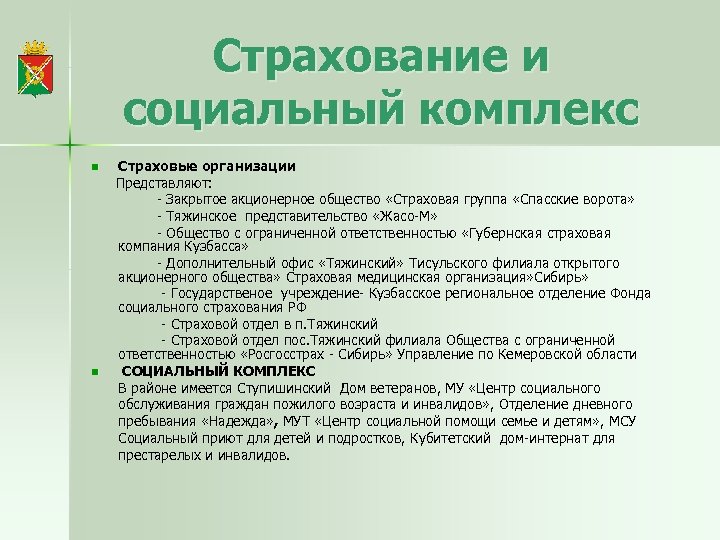 Страхование и социальный комплекс n n Страховые организации Представляют: - Закрытое акционерное общество «Страховая группа «Спасские ворота» - Тяжинское представительство «Жасо-М» - Общество с ограниченной ответственностью «Губернская страховая компания Кузбасса» - Дополнительный офис «Тяжинский» Тисульского филиала открытого акционерного общества» Страховая медицинская организация» Сибирь» - Государственое учреждение- Кузбасское региональное отделение Фонда социального страхования РФ - Страховой отдел в п. Тяжинский - Страховой отдел пос. Тяжинский филиала Общества с ограниченной ответственностью «Росгосстрах - Сибирь» Управление по Кемеровской области СОЦИАЛЬНЫЙ КОМПЛЕКС В районе имеется Ступишинский Дом ветеранов, МУ «Центр социального обслуживания граждан пожилого возраста и инвалидов» , Отделение дневного пребывания «Надежда» , МУТ «Центр социальной помощи семье и детям» , МСУ Социальный приют для детей и подростков, Кубитетский дом-интернат для престарелых и инвалидов.