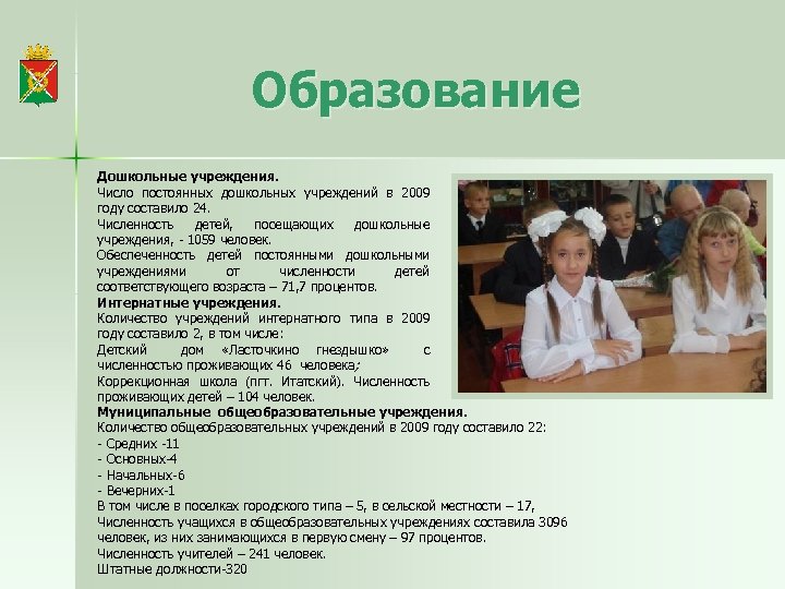 Образование Дошкольные учреждения. Число постоянных дошкольных учреждений в 2009 году составило 24. Численность детей, посещающих дошкольные учреждения, - 1059 человек. Обеспеченность детей постоянными дошкольными учреждениями от численности детей соответствующего возраста – 71, 7 процентов. Интернатные учреждения. Количество учреждений интернатного типа в 2009 году составило 2, в том числе: Детский дом «Ласточкино гнездышко» с численностью проживающих 46 человека; Коррекционная школа (пгт. Итатский). Численность проживающих детей – 104 человек. Муниципальные общеобразовательные учреждения. Количество общеобразовательных учреждений в 2009 году составило 22: - Средних -11 - Основных-4 - Начальных-6 - Вечерних-1 В том числе в поселках городского типа – 5, в сельской местности – 17, Численность учащихся в общеобразовательных учреждениях составила 3096 человек, из них занимающихся в первую смену – 97 процентов. Численность учителей – 241 человек. Штатные должности-320