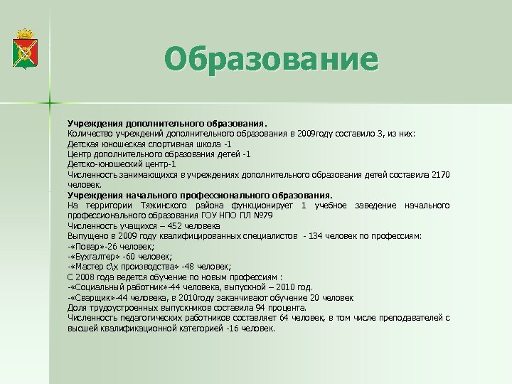 Образование Учреждения дополнительного образования. Количество учреждений дополнительного образования в 2009 году составило 3, из них: Детская юношеская спортивная школа -1 Центр дополнительного образования детей -1 Детско-юношеский центр-1 Численность занимающихся в учреждениях дополнительного образования детей составила 2170 человек. Учреждения начального профессионального образования. На территории Тяжинского района функционирует 1 учебное заведение начального профессионального образования ГОУ НПО ПЛ № 79 Численность учащихся – 452 человека Выпущено в 2009 году квалифицированных специалистов - 134 человек по профессиям: - «Повар» -26 человек; - «Бухгалтер» -60 человек; - «Мастер сх производства» -48 человек; С 2008 года ведется обучение по новым профессиям : - «Социальный работник» -44 человека, выпускной – 2010 год. - «Сварщик» -44 человека, в 2010 году заканчивают обучение 20 человек Доля трудоустроенных выпускников составила 94 процента. Численность педагогических работников составляет 64 человек, в том числе преподавателей с высшей квалификационной категорией -16 человек.