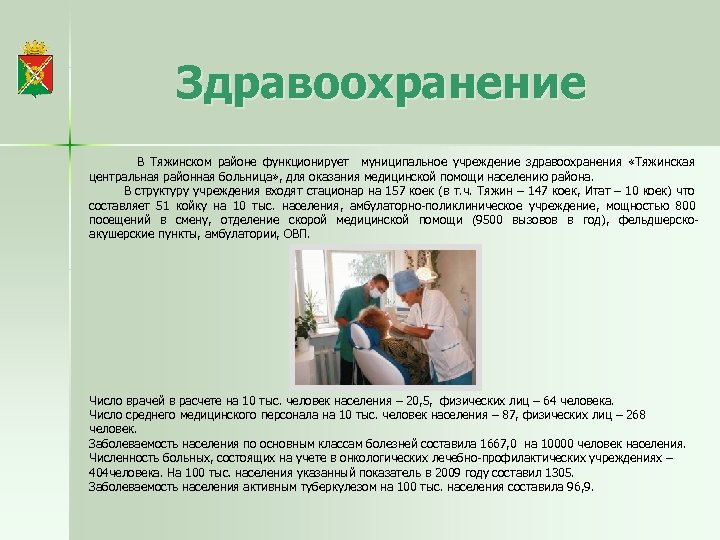 Здравоохранение В Тяжинском районе функционирует муниципальное учреждение здравоохранения «Тяжинская центральная районная больница» , для оказания медицинской помощи населению района. В структуру учреждения входят стационар на 157 коек (в т. ч. Тяжин – 147 коек, Итат – 10 коек) что составляет 51 койку на 10 тыс. населения, амбулаторно-поликлиническое учреждение, мощностью 800 посещений в смену, отделение скорой медицинской помощи (9500 вызовов в год), фельдшерскоакушерские пункты, амбулатории, ОВП. Число врачей в расчете на 10 тыс. человек населения – 20, 5, физических лиц – 64 человека. Число среднего медицинского персонала на 10 тыс. человек населения – 87, физических лиц – 268 человек. Заболеваемость населения по основным классам болезней составила 1667, 0 на 10000 человек населения. Численность больных, состоящих на учете в онкологических лечебно-профилактических учреждениях – 404 человека. На 100 тыс. населения указанный показатель в 2009 году составил 1305. Заболеваемость населения активным туберкулезом на 100 тыс. населения составила 96, 9.