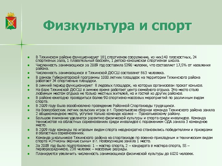 Физкультура и спорт n n n n В Тяжинском районе функционирует 181 спортивное сооружение, из них140 плоскостных, 24 спортивных зала, 1 плавательный бассейн, 1 детско-юношеская спортивная школа. Численность занимающихся за 2009 год составила 5390 человек, что составляет 17, 5% от населения района. Численность занимающихся в Тяжинской ДЮСШ составляет 863 человека. В рамках Губернаторской программы 1000 летних площадок на территории Тяжинского района работает 34 спортивные площадки. В зимний период функционирует 8 ледовых площадок, на которых организован прокат коньков. На базе Тяжинской ДЮСШ в зимнее время работает центр семейного отдыха. Это место стало любимым местом отдыха не только местных жителей, но и гостей из других районов. В районе ежегодно проводиться более 90 спортивно-массовых мероприятий по различным видам спорта. В 2009 году была возобновлено проведение Районной Спартакиады трудящихся. На Всекузбасских летних сельских играх в г. Прокопьевске сборная команда Тяжинского района заняла 2 общекомандное место, уступив только команде хозяев – Прокопьевскому району. Большое внимание уделяется развитию физической культуры и спорта среди инвалидов. Команда теннисистов на областных соревнованиях среди инвалидов с поражением ОДА заняла 3 командное место. В 2009 году команды по игровым видам спорта неоднократно становились победителями и призерами в областных соревнованиях. Команда школьников Тяжинского района на спартакиаде по военно-прикладным и техническим видам спорта «Отчизны верные сыны» в г. Новокузнецке заняла 1 место. За 2009 год было подготовлено: 1 – мастер спорта, 2 – кандидата в мастера спорта, 55 – перворазрядников, 238 человек – массовые разряды. Планируется увеличить численность занимающихся физической культуры до 6020 человек.