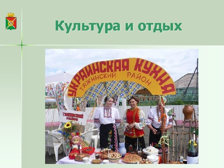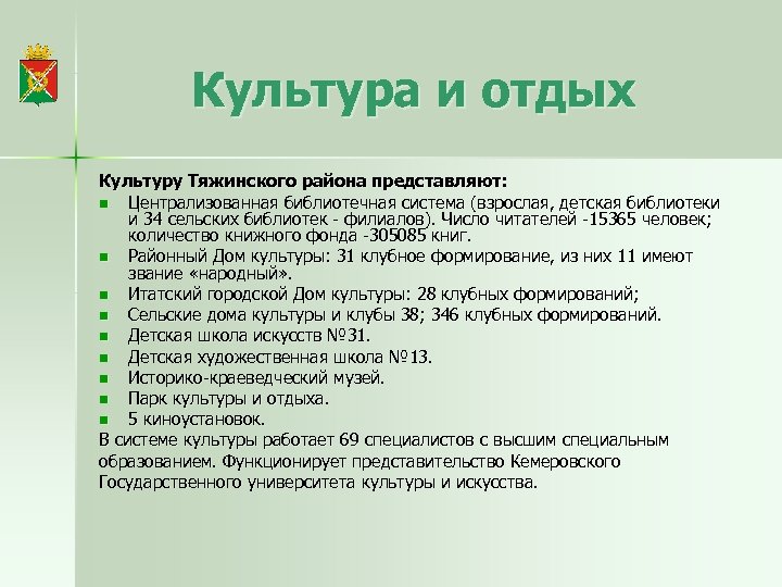 Культура и отдых Культуру Тяжинского района представляют: n Централизованная библиотечная система (взрослая, детская библиотеки и 34 сельских библиотек - филиалов). Число читателей -15365 человек; количество книжного фонда -305085 книг. n Районный Дом культуры: 31 клубное формирование, из них 11 имеют звание «народный» . n Итатский городской Дом культуры: 28 клубных формирований; n Сельские дома культуры и клубы 38; 346 клубных формирований. n Детская школа искусств № 31. n Детская художественная школа № 13. n Историко-краеведческий музей. n Парк культуры и отдыха. n 5 киноустановок. В системе культуры работает 69 специалистов с высшим специальным образованием. Функционирует представительство Кемеровского Государственного университета культуры и искусства.