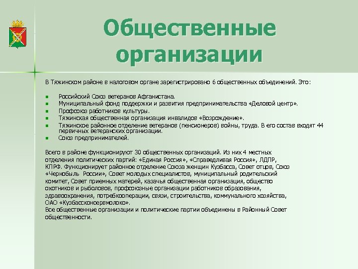 Общественные организации В Тяжинском районе в налоговом органе зарегистрировано 6 общественных объединений. Это: n n n Российский Союз ветеранов Афганистана. Муниципальный фонд поддержки и развития предпринимательства «Деловой центр» . Профсоюз работников культуры. Тяжинская общественная организация инвалидов «Возрождение» . Тяжинское районное отделение ветеранов (пенсионеров) войны, труда. В его состав входят 44 первичных ветеранских организации. Союз предпринимателей. Всего в районе функционируют 30 общественных организаций. Из них 4 местных отделения политических партий: «Единая Россия» , «Справедливая Россия» , ЛДПР, КПРФ. Функционирует районное отделение Союза женщин Кузбасса, Совет отцов, Союз «Чернобыль России» , Совет молодых специалистов, муниципальный родительский комитет, Совет приемных матерей, казачья общественная организация, общество охотников и рыболовов, профсоюзные организации работников образования, здравоохранения, потребкооперации, связи, строительства, коммунального хозяйства, ОАО «Кузбассконсервмолоко» . Все общественные организации и политические партии объединены в Районный Совет общественности.