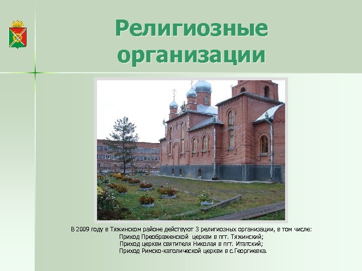 Религиозные организации В 2009 году в Тяжинском районе действуют 3 религиозных организации, в том числе: Приход Преображенской церкви в пгт. Тяжинский; Приход церкви святителя Николая в пгт. Итатский; Приход Римско-католической церкви в с. Георгиевка.
