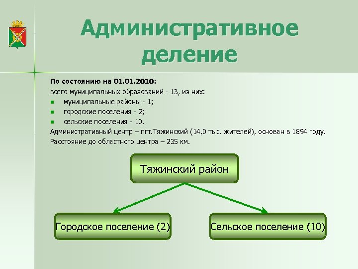 Административное деление По состоянию на 01. 2010: всего муниципальных образований - 13, из них: n муниципальные районы - 1; n городские поселения - 2; n сельские поселения - 10. Административный центр – пгт. Тяжинский (14, 0 тыс. жителей), основан в 1894 году. Расстояние до областного центра – 235 км. Тяжинский район Городское поселение (2) Сельское поселение (10)