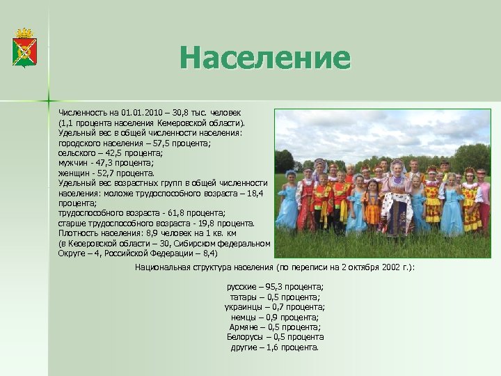 Население Численность на 01. 2010 – 30, 8 тыс. человек (1, 1 процента населения Кемеровской области). Удельный вес в общей численности населения: городского населения – 57, 5 процента; сельского – 42, 5 процента; мужчин - 47, 3 процента; женщин - 52, 7 процента. Удельный вес возрастных групп в общей численности населения: моложе трудоспособного возраста – 18, 4 процента; трудоспособного возраста - 61, 8 процента; старше трудоспособного возраста - 19, 8 процента. Плотность населения: 8, 9 человек на 1 кв. км (в Кесеровской области – 30, Сибирском федеральном Округе – 4, Российской Федерации – 8, 4) Национальная структура населения (по переписи на 2 октября 2002 г. ): русские – 95, 3 процента; татары – 0, 5 процента; украинцы – 0, 7 процента; немцы – 0, 9 процента; Армяне – 0, 5 процента; Белорусы – 0, 5 процента другие – 1, 6 процента.