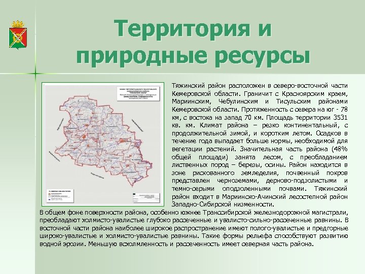 Территория и природные ресурсы Тяжинский район расположен в северо-восточной части Кемеровской области. Граничит с Красноярским краем, Мариинским, Чебулинским и Тисульским районами Кемеровской области. Протяженность с севера на юг - 78 км, с востока на запад 70 км. Площадь территории 3531 кв. км. Климат района – резко континентальный, с продолжительной зимой, и коротким летом. Осадков в течение года выпадает больше нормы, необходимой для вегетации растений. Значительная часть района (48% общей площади) занята лесом, с преобладанием лиственных пород – березы, осины. Район находится в зоне рискованного земледелия, почвенный покров представлен черноземами, дерново-подзолистыми и темно-серыми оподзоленными почвами. Тяжинский район входит в Мариинско-Ачинский лесостепной район Западно-Сибирской низменности. В общем фоне поверхности района, особенно южнее Транссибирской железнодорожной магистрали, преобладают холмисто-увалистые глубоко рассеченные и увалисто-сильно-рассеченные равнины. В восточной части района наиболее широкое распространение имеют полого-увалистые и предгорные широко-увалистые и холмисто-увалистые равнины. Такие формы рельефа способствуют развитию водной эрозии. Меньшую всхолмленность и рассеченность имеет северная часть района.