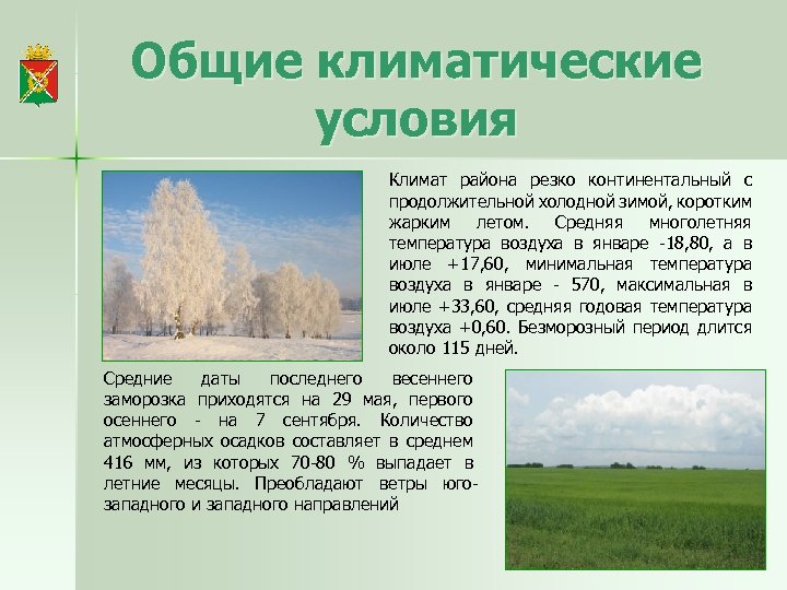 Общие климатические условия Климат района резко континентальный с продолжительной холодной зимой, коротким жарким летом. Средняя многолетняя температура воздуха в январе -18, 80, а в июле +17, 60, минимальная температура воздуха в январе - 570, максимальная в июле +33, 60, средняя годовая температура воздуха +0, 60. Безморозный период длится около 115 дней. Средние даты последнего весеннего заморозка приходятся на 29 мая, первого осеннего - на 7 сентября. Количество атмосферных осадков составляет в среднем 416 мм, из которых 70 -80 % выпадает в летние месяцы. Преобладают ветры югозападного и западного направлений