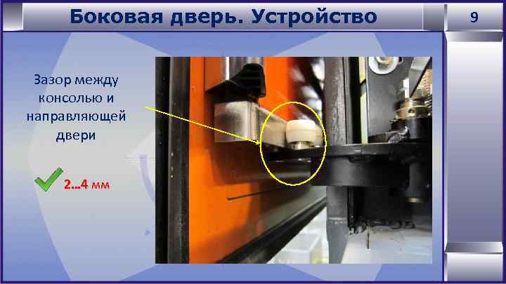 Боковая дверь. Устройство Зазор между консолью и направляющей двери 2… 4 мм 9
