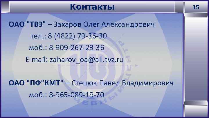 Контакты ОАО "ТВЗ" – Захаров Олег Александрович тел. : 8 (4822) 79 -36 -30 моб. : 8 -909 -267 -23 -36 E-mail: zaharov_oa@all. tvz. ru 15