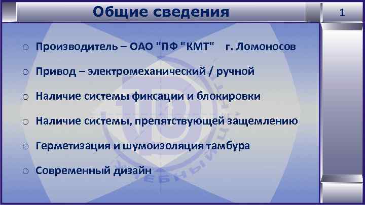 Общие сведения o Производитель – ОАО "ПФ "КМТ" г. Ломоносов o Привод – электромеханический / ручной o Наличие системы фиксации и блокировки o Наличие системы, препятствующей защемлению o Герметизация и шумоизоляция тамбура o Современный дизайн 1