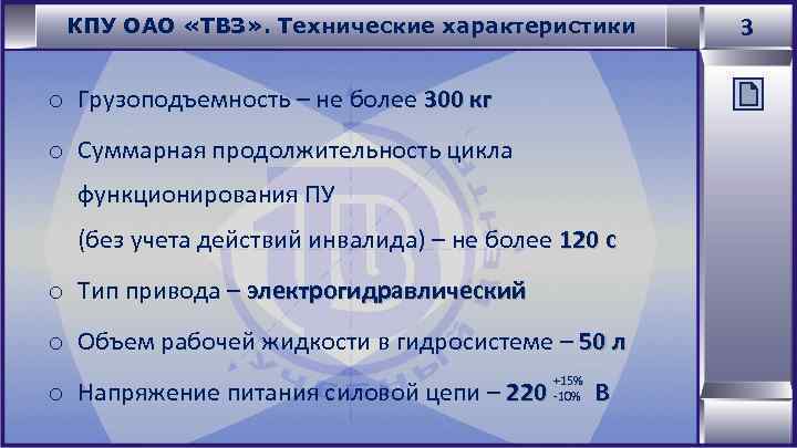 КПУ ОАО «ТВЗ» . Технические характеристики o Грузоподъемность – не более 300 кг o Суммарная продолжительность цикла функционирования ПУ (без учета действий инвалида) – не более 120 с o Тип привода – электрогидравлический o Объем рабочей жидкости в гидросистеме – 50 л o Напряжение питания силовой цепи – 220 +15% -10% В 3
