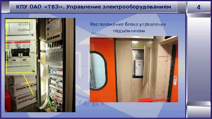 КПУ ОАО «ТВЗ» . Управление электрооборудованием Расположение блока управления подъемником 4