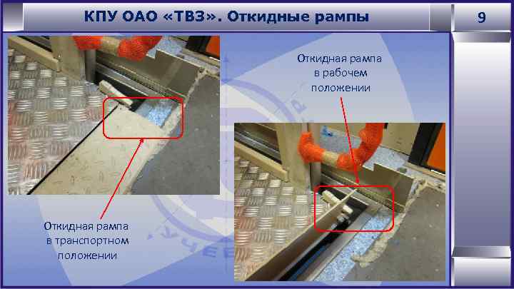КПУ ОАО «ТВЗ» . Откидные рампы Откидная рампа в рабочем положении Откидная рампа в транспортном положении 9