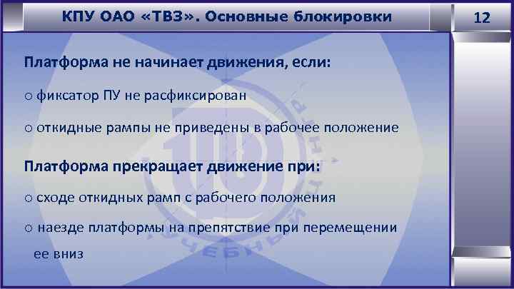 КПУ ОАО «ТВЗ» . Основные блокировки Платформа не начинает движения, если: o фиксатор ПУ не расфиксирован o откидные рампы не приведены в рабочее положение Платформа прекращает движение при: o сходе откидных рамп с рабочего положения o наезде платформы на препятствие при перемещении ее вниз 12