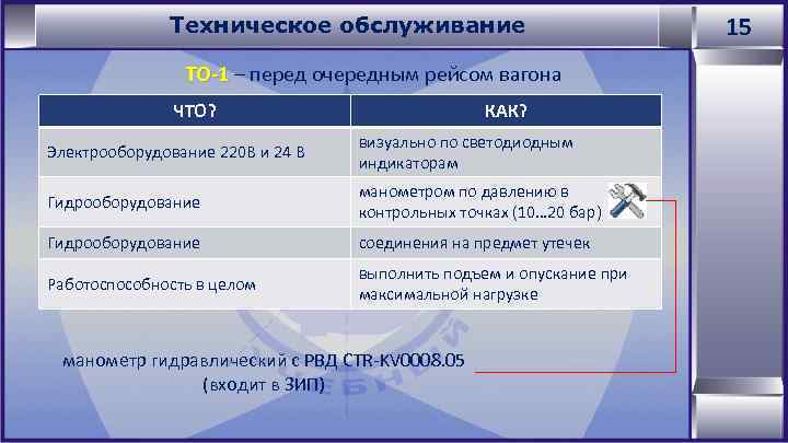Техническое обслуживание ТО-1 – перед очередным рейсом вагона ЧТО? КАК? Электрооборудование 220 В и 24 В визуально по светодиодным индикаторам Гидрооборудование манометром по давлению в контрольных точках (10… 20 бар) Гидрооборудование соединения на предмет утечек Работоспособность в целом выполнить подъем и опускание при максимальной нагрузке манометр гидравлический с РВД CTR-KV 0008. 05 (входит в ЗИП) 15