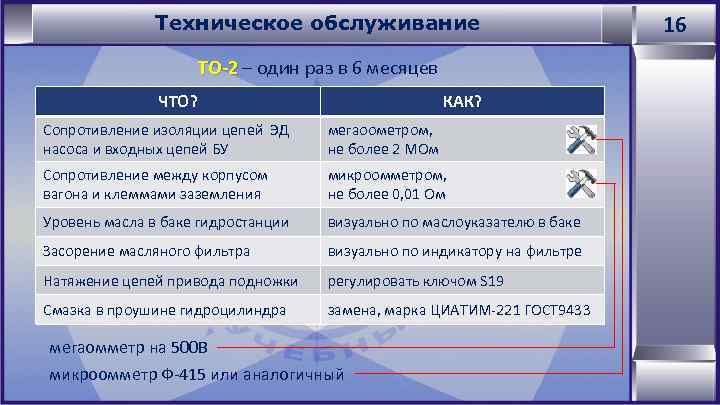 Техническое обслуживание ТО-2 – один раз в 6 месяцев ЧТО? КАК? Сопротивление изоляции цепей ЭД насоса и входных цепей БУ мегаоометром, не более 2 МОм Сопротивление между корпусом вагона и клеммами заземления микроомметром, не более 0, 01 Ом Уровень масла в баке гидростанции визуально по маслоуказателю в баке Засорение масляного фильтра визуально по индикатору на фильтре Натяжение цепей привода подножки регулировать ключом S 19 Смазка в проушине гидроцилиндра замена, марка ЦИАТИМ-221 ГОСТ 9433 мегаомметр на 500 В микроомметр Ф-415 или аналогичный 16