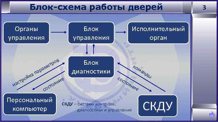 Блок-схема работы дверей Органы управления Блок диагностики в тро е ап йк ро ст на м ара ие ян то сос Персональный компьютер Исполнительный орган ко ма н сос тоя ни СКДУ – система контроля, диагностики и управления ды е СКДУ 3