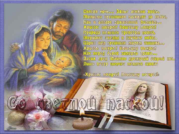 В праздник благодатный, В этот день чудес, Дверь открыта и … Христос Воскрес! Света, мира, счастья, Надежды и добра Пусть будет всё прекрасной, Будет жизнь полна!