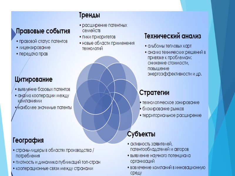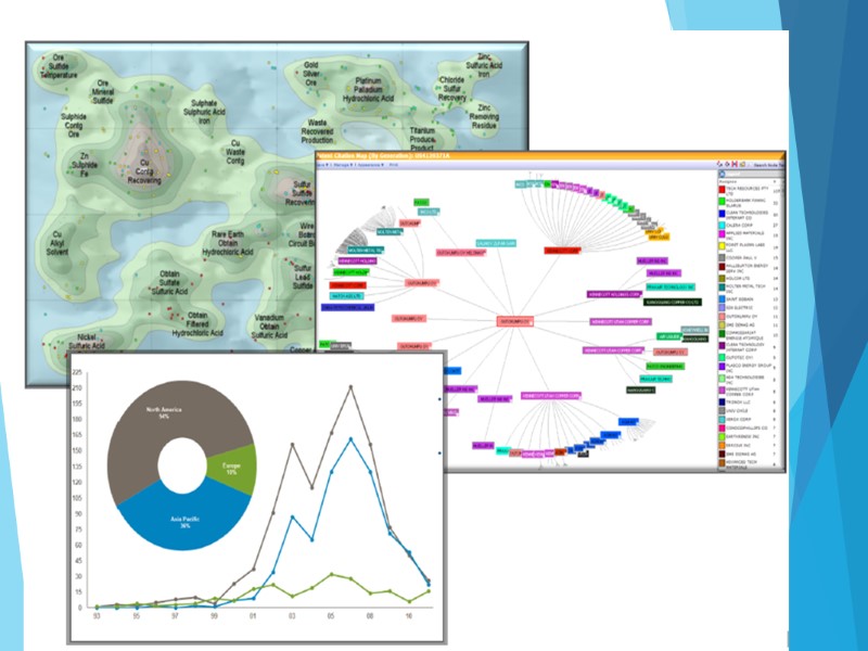 Патентные ландшафты Патентный ландшафт –отчет о состоянии патентной активности в определенной технологии в данной стране, регионе или в мире. Основной отличительной чертой ПЛ является визуализация результатов с целью их лучшего понимания, а также визуализация выводов и рекомендаций, основанных на заключениях поиска и анализа.