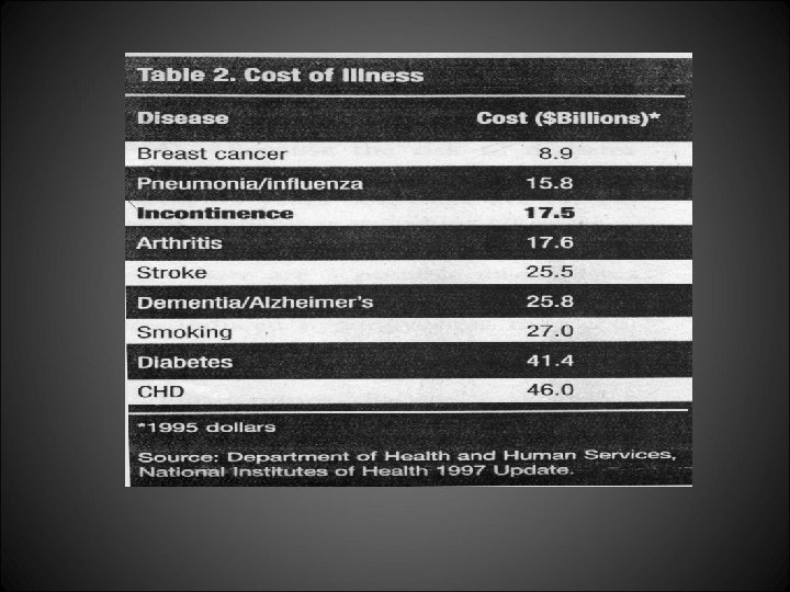Economic burden of UI • Cost is associated with UI whether the woman is treated or NOT. • If a woman is afraid to seek medical attention, then diagnostic and treatment costs will be zero. • Costs are also incurred when UI is untreated. These include routine care costs (disposable garments and laundry), consequence costs (falls and hospital admissions), indirect costs (lost productivity) and intangible costs (pain, stress and suffering).