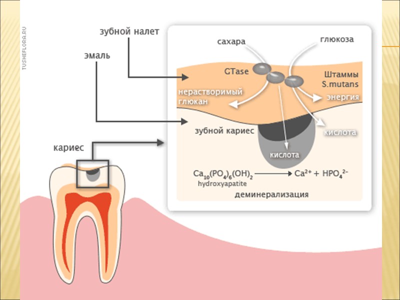 Механизм адгезии бактерий к пелликуле зуба Электростатический – отрицательно заряженные колонии бактерии взаимодействуют с положительно заряженными ионами кальция расположенными на поверхности пелликулы Рецепторы бактерий взаимодействуют с гликопротеинами пелликулы. St.mutans, имеющие фермент гликозилтрансферазу, превращают глюкозу в мягкий глюкановый матрикс, это способствует адгезии и агрегации бактерий, а также препятствует диффузии молочной кислоты с поверхности зуба