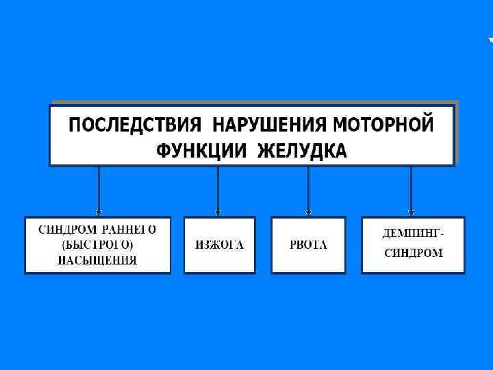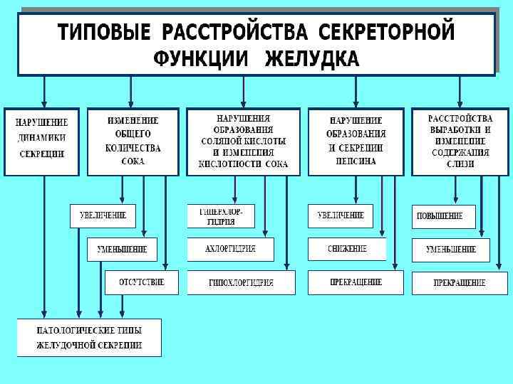 Типы патологической желудочной секреции o Возбудимый тип — быстрое и интенсивное нарастание секреции o o в первую фазу, ее длительное продолжение и относительно медленный спад во вторую. Моторика характеризуется гиперкинезом. Тормозный — секреция и моторика снижены в обе фазы. Астенический — в первую фазу быстрое нарастание секреции и бурная моторика, но длится это недолго; во вторую фазу быстрый спад секреции и гипокинезия желудка. Инертный — в первую фазу секреция и моторика нарастают медленно, но затем долго держатся на высоком уровне и медленно угасают. Хаотический — отсутствуют какие-либо закономерности динамики секреции и моторики.