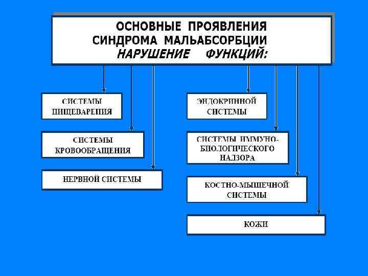 Формы синдрома мальабсорбции (по причине возникновения) o Гастрогенный (и агастральный) СМ: хронические гастриты o o o с секреторной недостаточностью, резекция желудка, демпинг-синдром; Гепатогенный СМ: хронические гепатиты, циррозы печени, холестаз; Панкреатогенный СМ: хр. панкреатиты, муковисцидоз, резекция pancreas; Энтерогенный СМ: - Неинфекционные: ферментопатии (недостаточность дисахаридаз, лактазы, сахаразы); - Инфекционные: бактериальные, вирусные, паразитарные; Сосудистый СМ: хр. интестинальная ишемия (гликемический энтерит, ишемический колит); Эндокринный СМ: диабетическая энтеропатия; Другие СМ: лекарственные, радиационные, токсические (алкогольный, уремический).