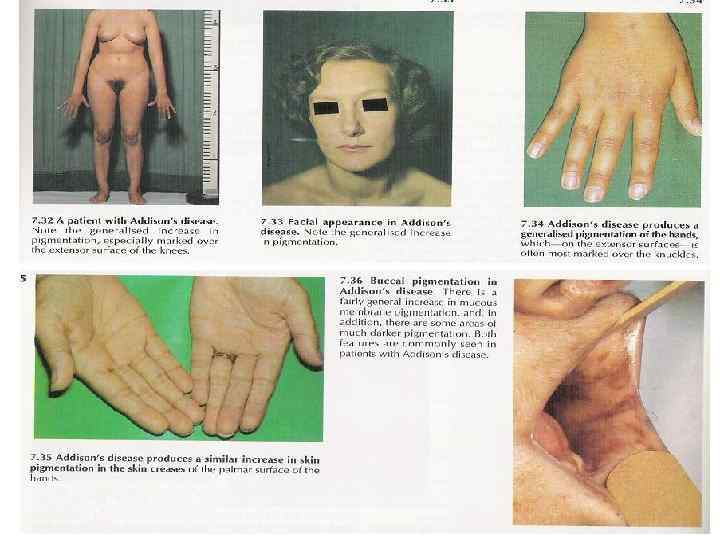 Надпочечниковая недостаточность (болезнь Адиссона) • Гиперпигментация (Увеличение образования АКТГ) • Гипотензия • Ортостатические нарушения • Кома • Истощение • Гипонатриемия • Гиперкалиемия • Гипогликемия