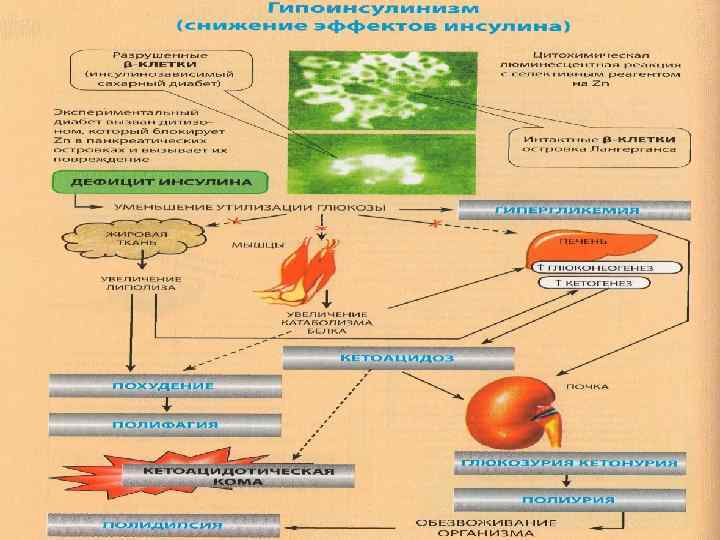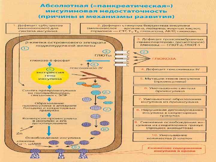 ОСНОВНЫЕ ЗВЕНЬЯ ПАТОГЕНЕЗА АБСОЛЮТНОЙ ИНСУЛИНОВОЙ НЕДОСТАТОЧНОСТИ ПАТОГЕННЫЕ ФАКТОРЫ Повреждение -клеток Поджелудочной железы (более 80% их) Подавление процессов: биосинтеза проинсулина транспорта проинсулина к аппарату Гольджи АБСОЛЮТНЫЙ расщепления проинсулина везикуляции до инсулина девезикуляции и выделения инсулина в интерстиций ГИПОИНСУЛИНИЗМ (ИЗСД)