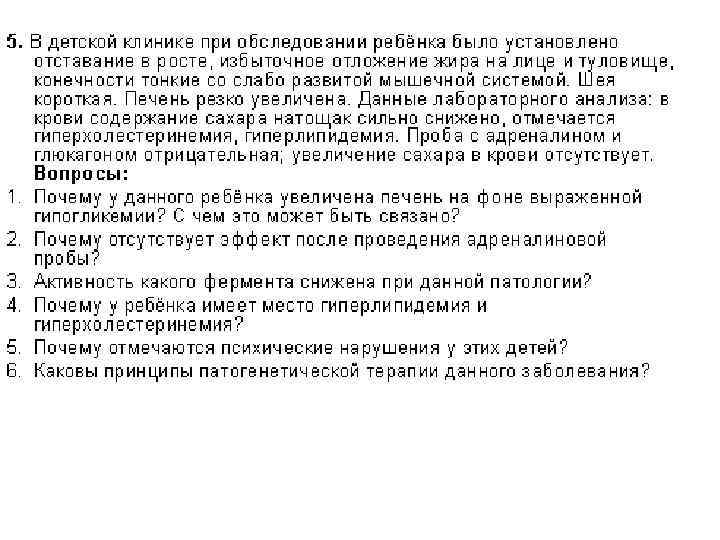 I 5. ОСНОВНОЙ ПАТОГЕНЕТИЧЕСКИЙ ФАКТОР ВОЗНИКНОВЕНИЯ ДИАБЕТА 2 -ГО ТИПА 1) блок превращения проинсулина в инсулин 2) дефицит, низкая аффинность к инсулину рецепторов эффекторных клеток - "мишеней" 3) гипергликемия 4) гиперкетонемия II 5. ГЛИКОГЕНОЗ 1 -ГО ТИПА (БОЛЕЗНЬ ГИРКЕ) ОБУСЛОВЛЕН ДЕФЕКТОМ 1) глюкозо-6 -фосфатазы 2) альфа- 1, 4 - глюкозидазы 3) амило – 1, 6 -глюкозидазы 4)фосфоглюкомутазы 5)фосфофруктомутазы