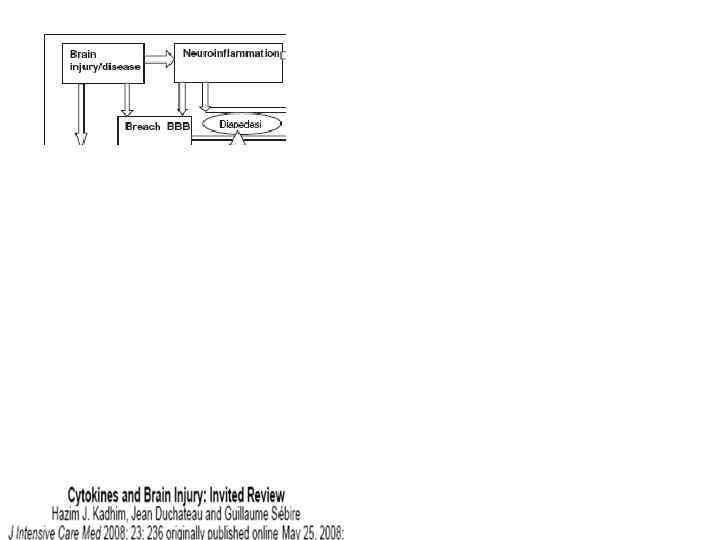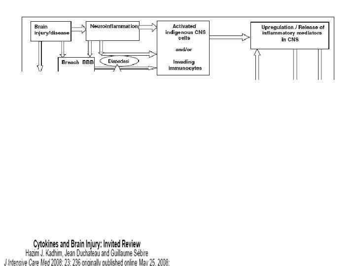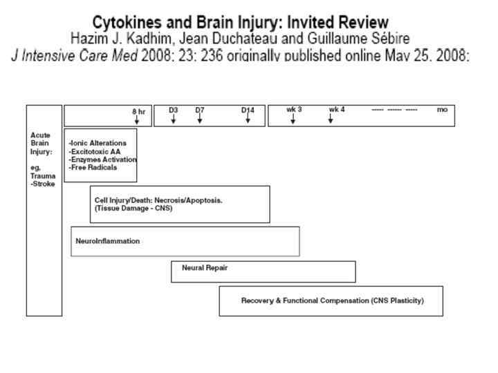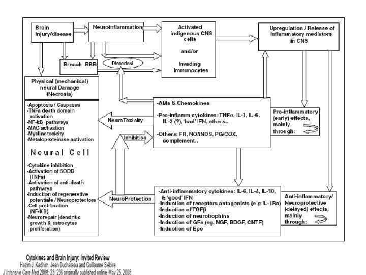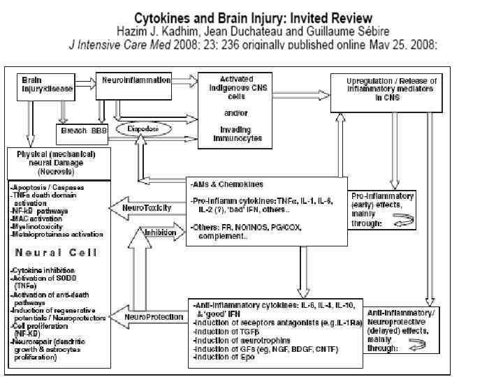 Компоненты иммуновоспалительной при ОЦН • Иммуновоспалительные медиаторы ОЦН • Цитокины • Хемокины • Молекулы адгезии • Система простагландинов-циклооксигеназа (PG-COX) • Система нитрит оксид (NO)нитрит оксид синтетаза (NOS) • Комплемент • Основные клетки • Активированная микроглия и моноцитарные макрофаги • Активированные астроциты • Мигрирующие лейкоциты и периферические иммуноциты • ГЭБ и эндотелиальные клетки • Компоненты терапевтического иммуномодулирующего воздействия (нейроиммунная модуляция) • антицитокины и антихемокины (блокаторы, ингтбиторы) • Антагонисты рецепторов • Ингибиторы индуцированный оксид азот синтетазы (i. NOS) и утильщикы оксид азота (NO) • Ингибиторы циклооксигеназы (COX) • Антагонисты комплемента • Модификаторы молекул клеточной адгезии (CAM) • Ингибиторы каспазы • «полезные» цитокины (интерферон ) • Другие фармсредства с плюрипотентным или антивоспалительным эффектом • Статины • Миноциклин • Эритропоэтин • Гранулоцитарные факторы • Противовоспалительные цитокины • Нестероидные противовоспалительные средства