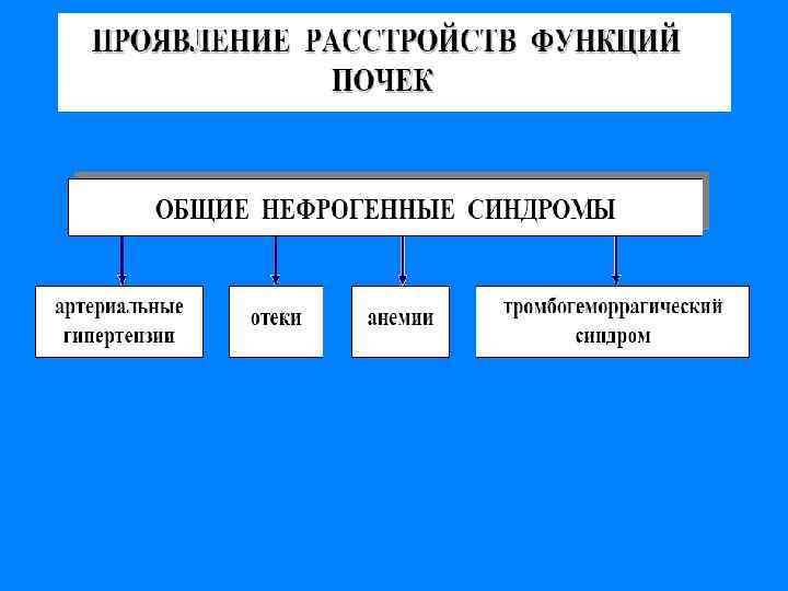 Стадии развития ХПН Латентная: Фаза А. Характеризуется нормальными показателями содержания креатинина в плазме крови и объема клубочковой фильтрации, но при проведении нагрузочных проб на концентрацию и разведение выявляется уменьшение функционального резерва почек. Фаза Б. В ней уровень креатинина в сыворотке соответствует верхней границе нормы, а размер клубочковой фильтрации составляет 50% от должного Гиперазотемическая: Концентрация креатинина в сыворотке крови 0, 13 ммоль/л и выше, мочевины – 11 ммоль/л и выше. Фаза А. Клубочковая фильтрация понижена до 40 -20% Фаза Б. Клубочковая фильтрация понижена до 19 -10% от должной. Уремическая: Характеризуется снижением объема клубочковой фильтрации до 10 -5% от должного, имеется высокая степень гиперазотемии и клинические признаки уремии.