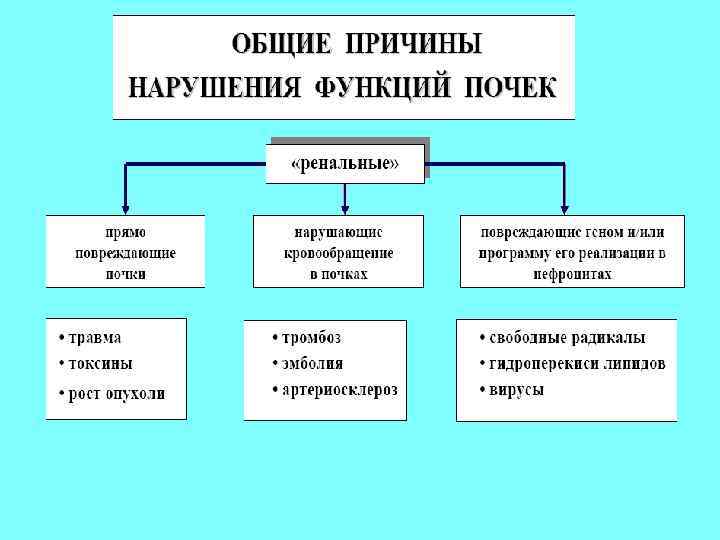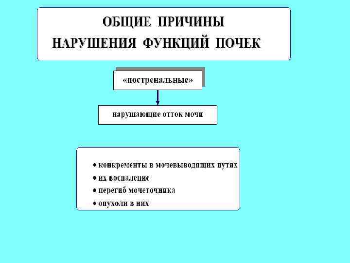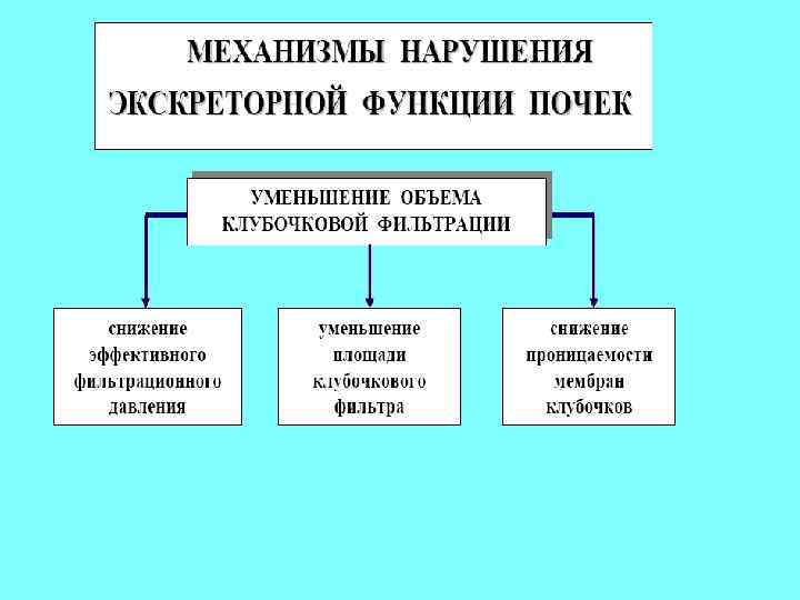 Причины, уменьшающие клубочковую фильтрацию Почечные причины: 1. Уменьшение числа клубочков 2. Снижение проницаемости фильтрирующей мембраны (иммунные компоненты) 3. Склеротические изменения в приносящих артериолах 4. Увеличение давления в полости капсулы Боумена