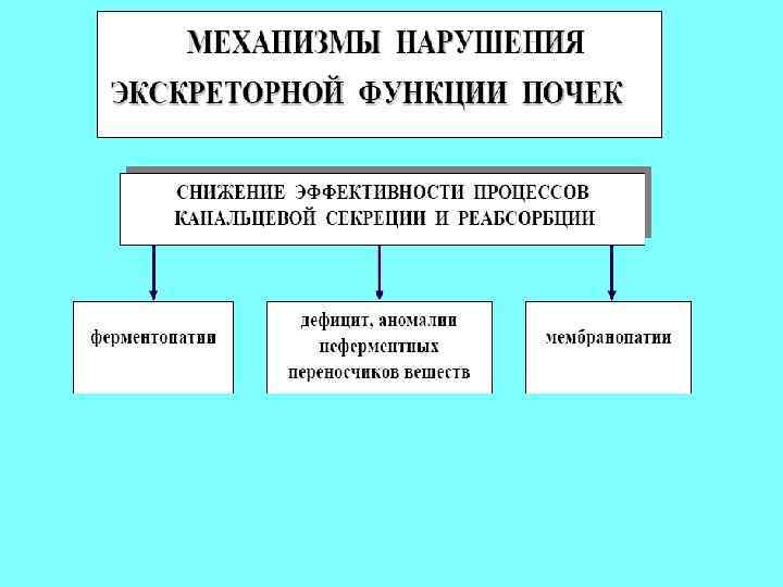 Причины нарушающие реабсорбцию n n n n Наследственные - отсутствие или снижение активности ферментов, необходимых для активного транспорта; нечувствительность (нарушение рецепторного аппарата) мембран канальцевого эпителия. Приобретенные -при угнетении ферментов токсинами, ядами, некоторыми лекарствами (соли ртути, свинца, урана, антибиотики мономицин, канамицин); -при воспалительных и дистрофических процессах в канальцах; -при нарушении гормональной регуляции канальцевой реабсорбции. Наследственная энзимопатия, приводящая к снижению чувствительности канальцевого эпителия к паратгормону или уменьшению его выработки по причине удаления части ткани паращитовидных желез -выведение фосфатов и Ca++ из организма , обозначается как “фосфатный почечный диабет” проявляется деминерализацией костей, остеомаляцией, клиникой рахита у детей. Синдром Факони, при котором одновременно нарушена реабсорбция фосфатов, глюкозы, аминокислот, гидрокарбонатов, что формирует “осмотический диурез”, который приводит к обезвоживанию организма. Вторичный синдром Фанкони развивается при миеломной болезни, при которой формируется выраженная тубулопатия.