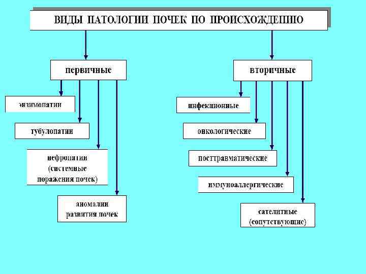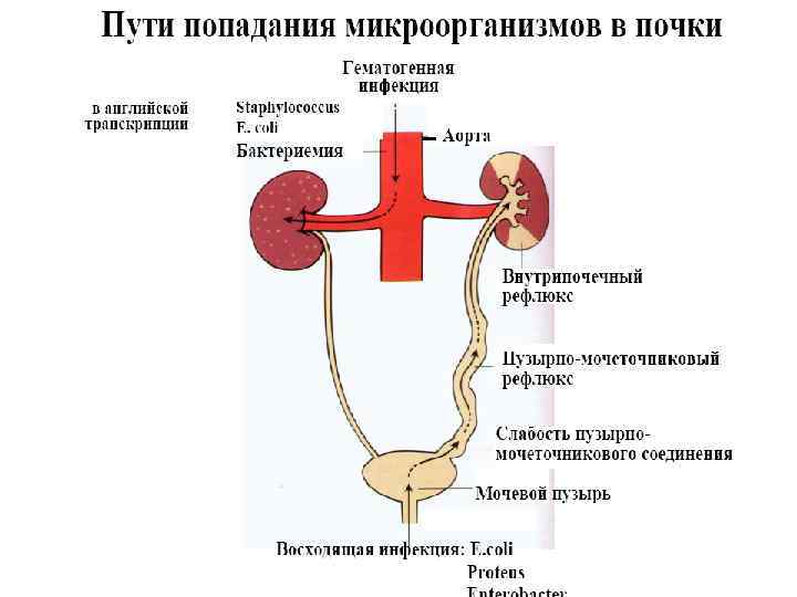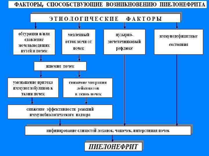 Пиелонефрит Инфекционно воспалительное заболевание слизистой оболочки мочевых путей и паренхимы почек с преимущественным поражением интерстициальной ткани. Этиология - кишечная палочка, стрептококк, протей, стафилококк, клепсиелла. инфекция может попадать в почку гематогенным путем при кариесе, пневмонии, фурункулезе, остеомиелите или заноситься по мочевым путям в восходящем направлении