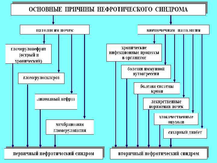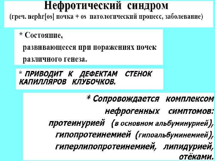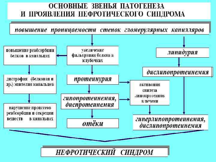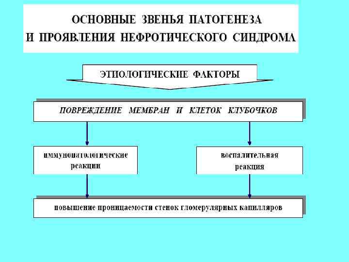 Патогенез нефротического синдрома В основе заболевания лежат дистрофические изменения в почечных канальцах на фоне повышения проницаемости клубочкового фильтра для белков плазмы крови. Усиления проницаемости гломерулярного фильтра объясняется повреждением отростков подоцитов и клеток базальной мембраны при действии на них иммунных комплексов.