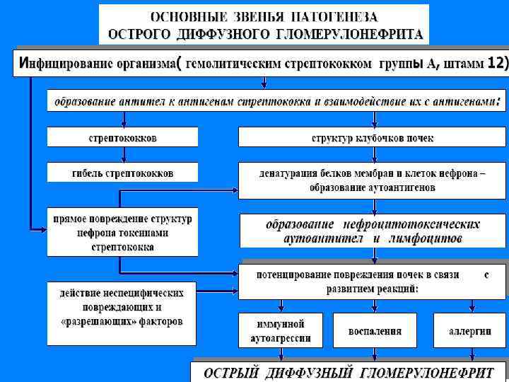 Гломерулонефриты n n Это группа заболеваний, характеризующихся развитием воспаления клубочков обеих почек и клеточной пролиферацией, которые сочетаются с гематоурией. По механизму развития гломерулонефриты относятся к заболеваниям иммунного генеза. По патогенезу: иммуннокомплексный обусловленный образованием аутоантител к антигенам базальной мембраны капилляров клубочков.