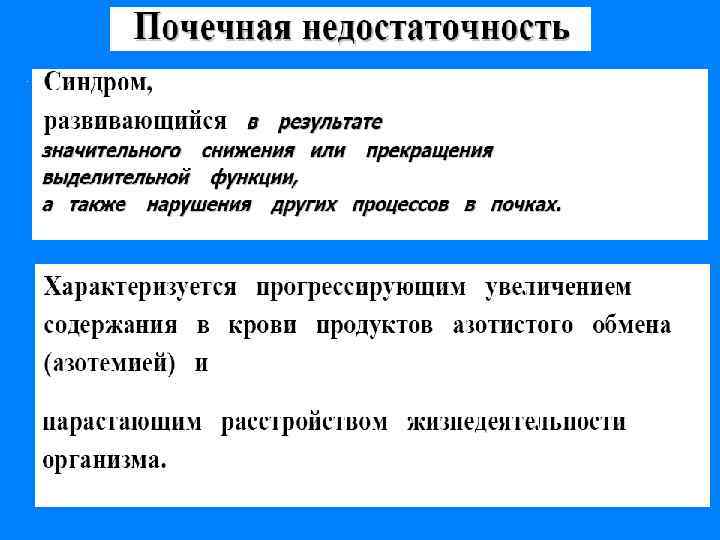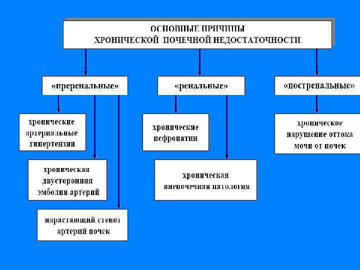 Хроническая почечная недостаточность n n Состояние хронической почечной недостаточности характеризуется медленно прогрессирующей утратой функции почек, обусловленной постепенной гибелью нефронов с замещением их соединительной тканью. Это процесс необратим. Этиология: К развитию ХПН приводят: хронический пиелонефрит, хронический гломерулонефрит, диабетическая нефропатия, амилоидоз, поликистоз, системная красная волчанка, длительная обструкция мочевых путей и др.