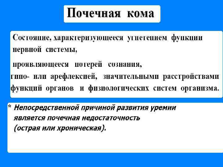 Уремия Это состояние организма, развивающееся при почечной недостаточности, вследствие интоксикации организма продуктами ( «уремические токсины» ), которые в норме выводятся почками. Основными патогенетическими факторами уремии являются: – Интоксикация организма азотистыми шлаками (аммиак, производные аммония): определенную роль также играют фенол, индол, скатол – Повреждение этими токсинами мембран клеток с нарушением их метаболизмами, формированием энергодефицита – Вследствие нарушения экскреции развивается тяжелый метаболический ацидоз – Развивающаяся гипоксемия и тканевая гипоксия сопровождаются усилением процессов катаболизма, распада белков, что вместе с желудочно-кишечными нарушениями способствует развитию кахексии. – Нарушение баланса основных ионов и воды в плазме крови и тканях – Нарушение электрофизиологических свойств клеток ЦНС, миокарда. – Дыхание Куссмауля