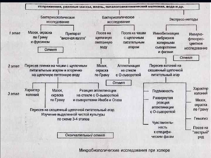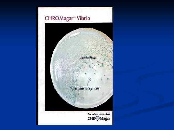 Лабораторная диагностика Бактериологическое исследование материала: испражнений, рвотных масс, промывных вод желудка; трупного материала (отрезки тонкого кишечника и желчный пузырь); в очаге эпидемической ситуации – пищевые продукты; из объектов окружающей среды – морская вода, ил, различные гидробионты, а также изготовленные из них пищевые продукты.