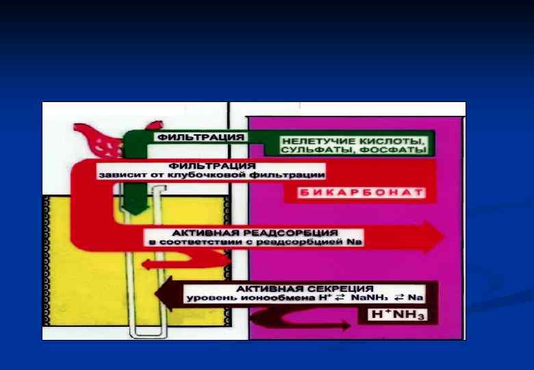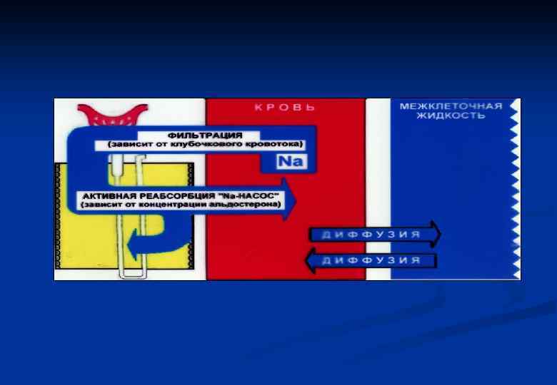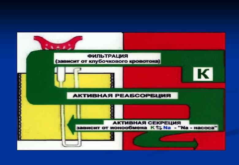 n Задержка калия Снижение фильтрации Снижение секреции ОПН, ХПН Последствия: гиперкалиемия (показание для гемодиализа), аритмии n Потеря калия снижение реабсорбции гиперальдостеронизм диуретики Последствия : гипотонус мышц, слабость, атриовентрикулярные блокады