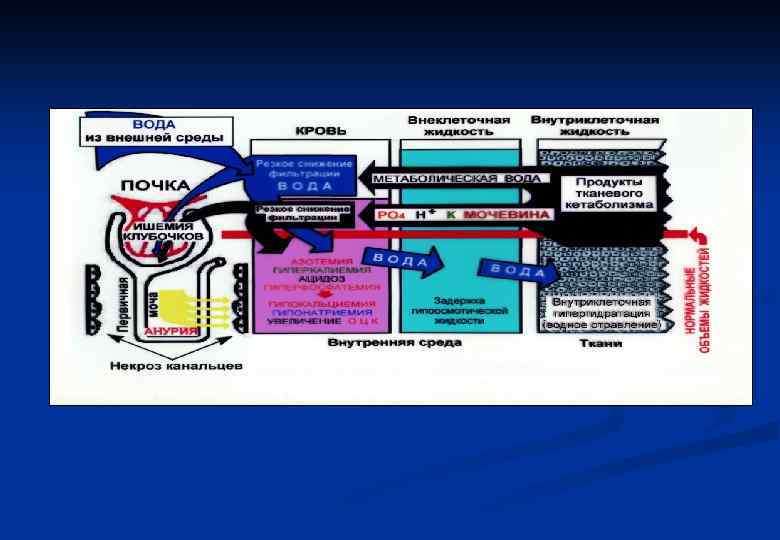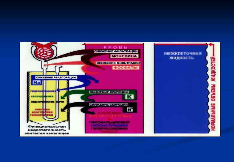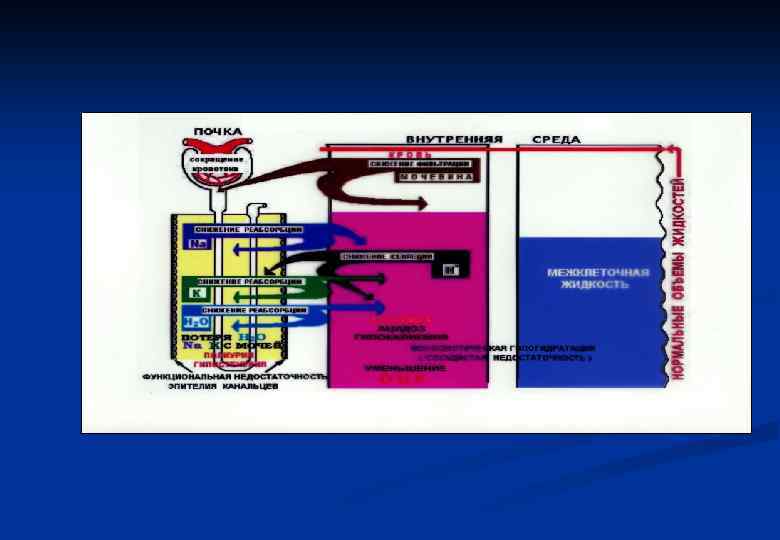 Последствия расстройства экскреторной (мочеобразующей) функции почек n n n • Нарушения водного гомеостаза - изменения объема внеклеточной жидкости (гипер и гипогидратация). • Нарушения осмотического гомеостаза - гипер и гипоосмия. • Нарушения баланса электролитов во внеклеточной жидкости • Нарушения кислотноосновного состояния (чаще негазовый ацидоз) Нарушения химического состава плазмы крови: 1. Накопление конечных продуктов метаболизма (азотемия); 2. Потеря необходимых организму химических соединений.