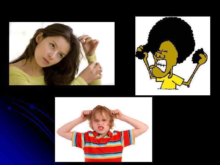 Трихотилломания Трихотилломания — выдергивание волос на волосистой части головы, бровей, иногда сопровождающееся чувством удовольствия. Выдергивание волос происходит на строго определенном участке головы. Соседние с облысением участки головы депиляции не подвергаются, а после отрастания волосы выдергивают снова. В некоторых случаях волосы выдергивают по всей поверхности головы, что приводит к тотальному облысению. Указанные действия часто сопровождаются снижением порога болевой чувствительности.